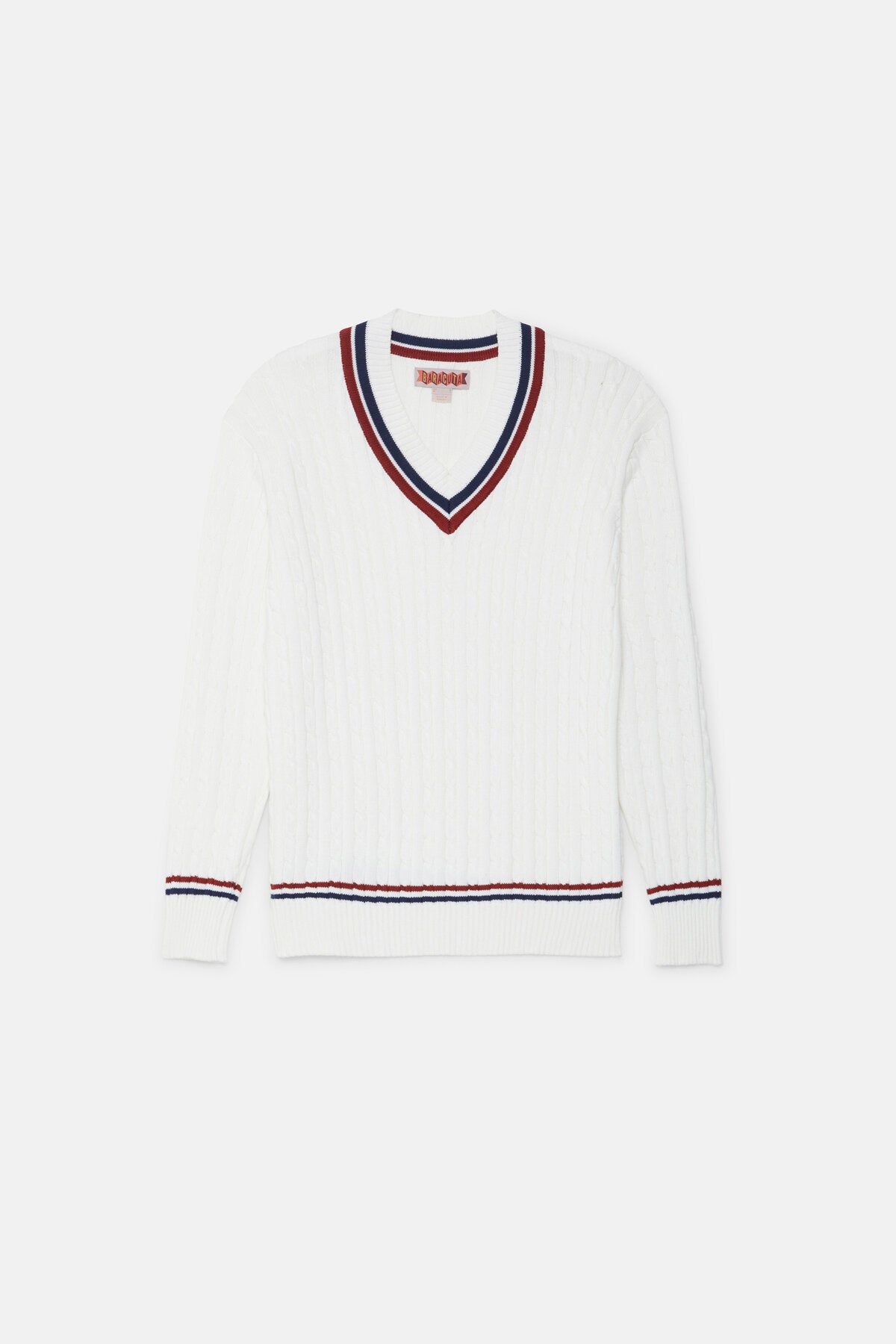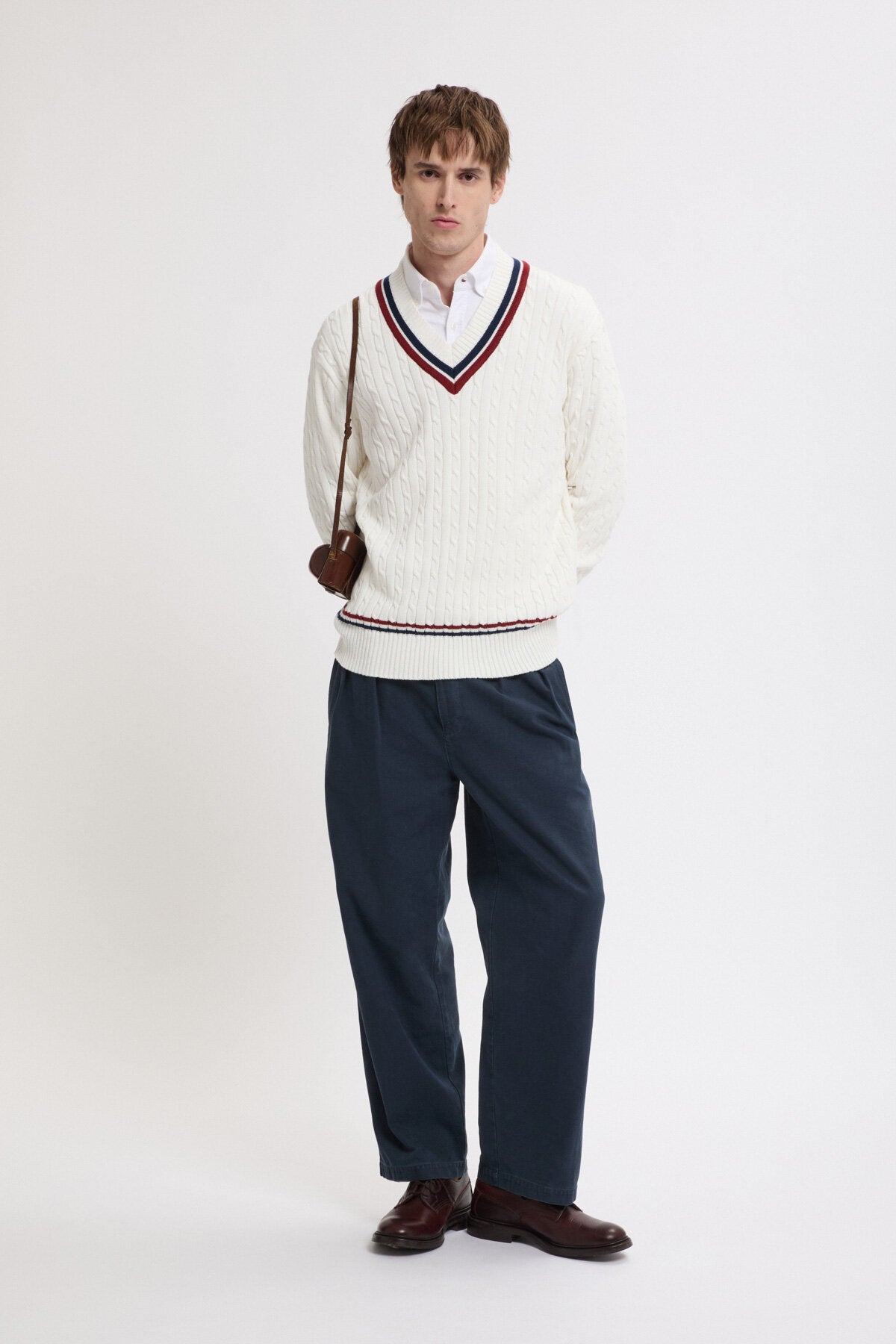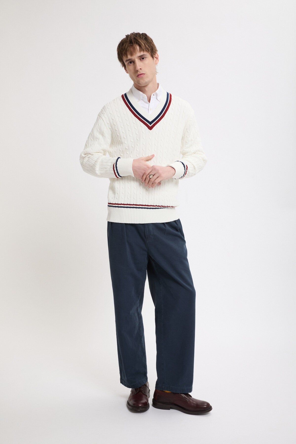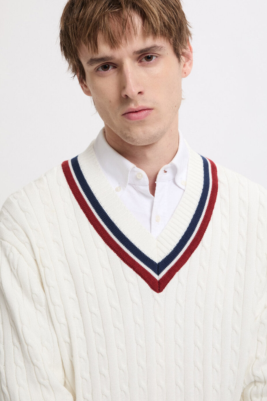 • Der Cricket V‑Neck besteht aus 100 % Baumwollstrick im Cable‑Knit‑Design – weich im Griff und zugleich robust genug für den täglichen Einsatz.