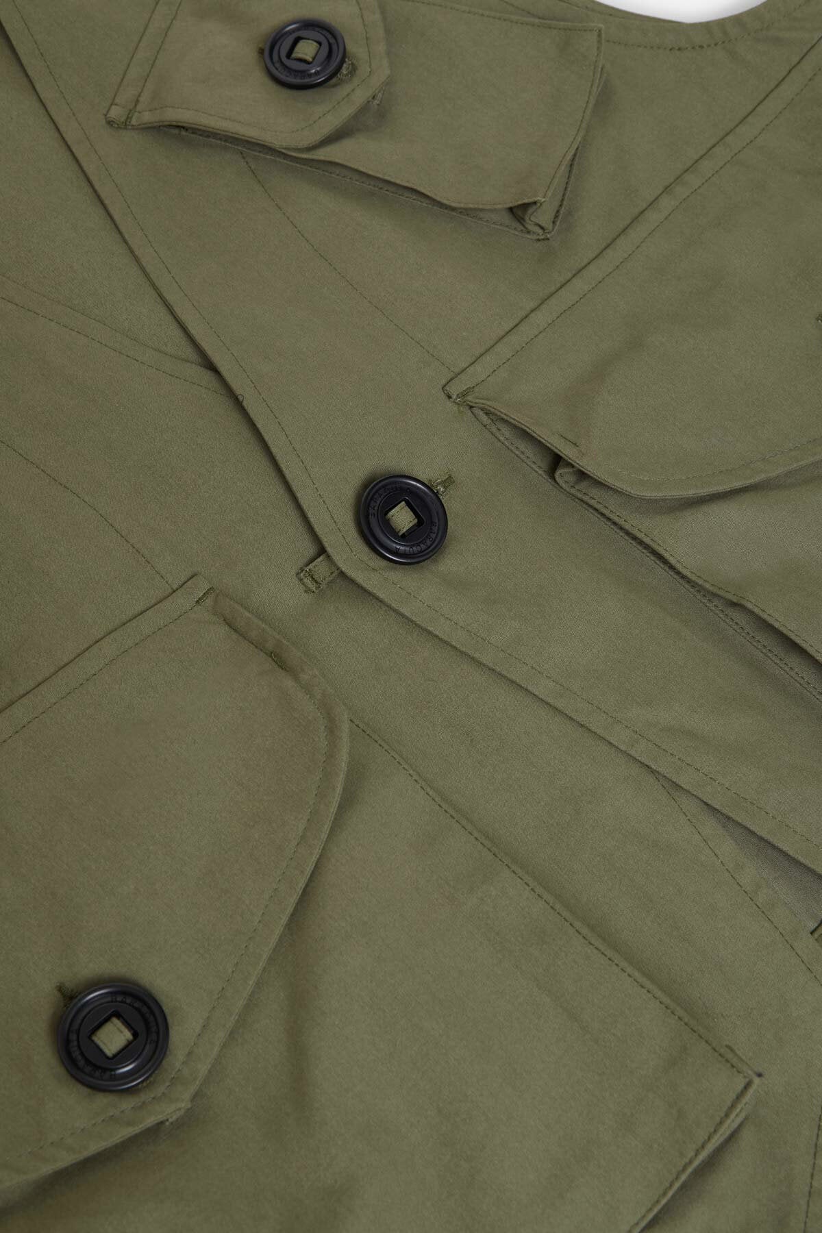• • Zwei rechteckige Brusttaschen und übergroße aufgesetzte Taschen mit Patte und Knopfverschluss auf der Vorderseite