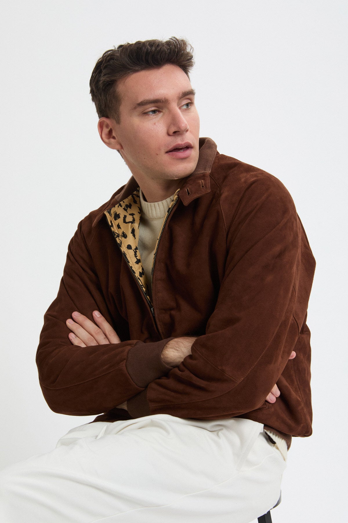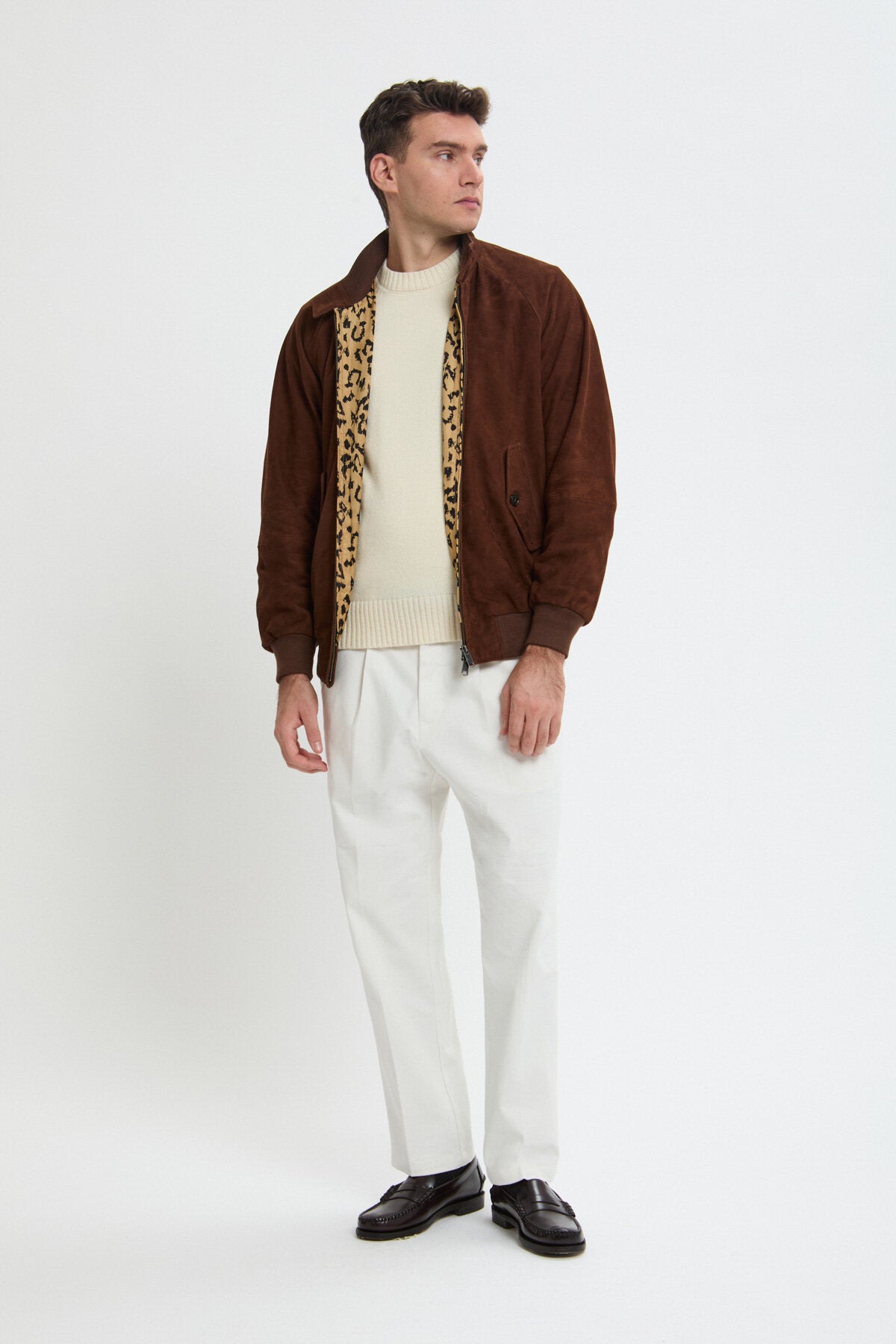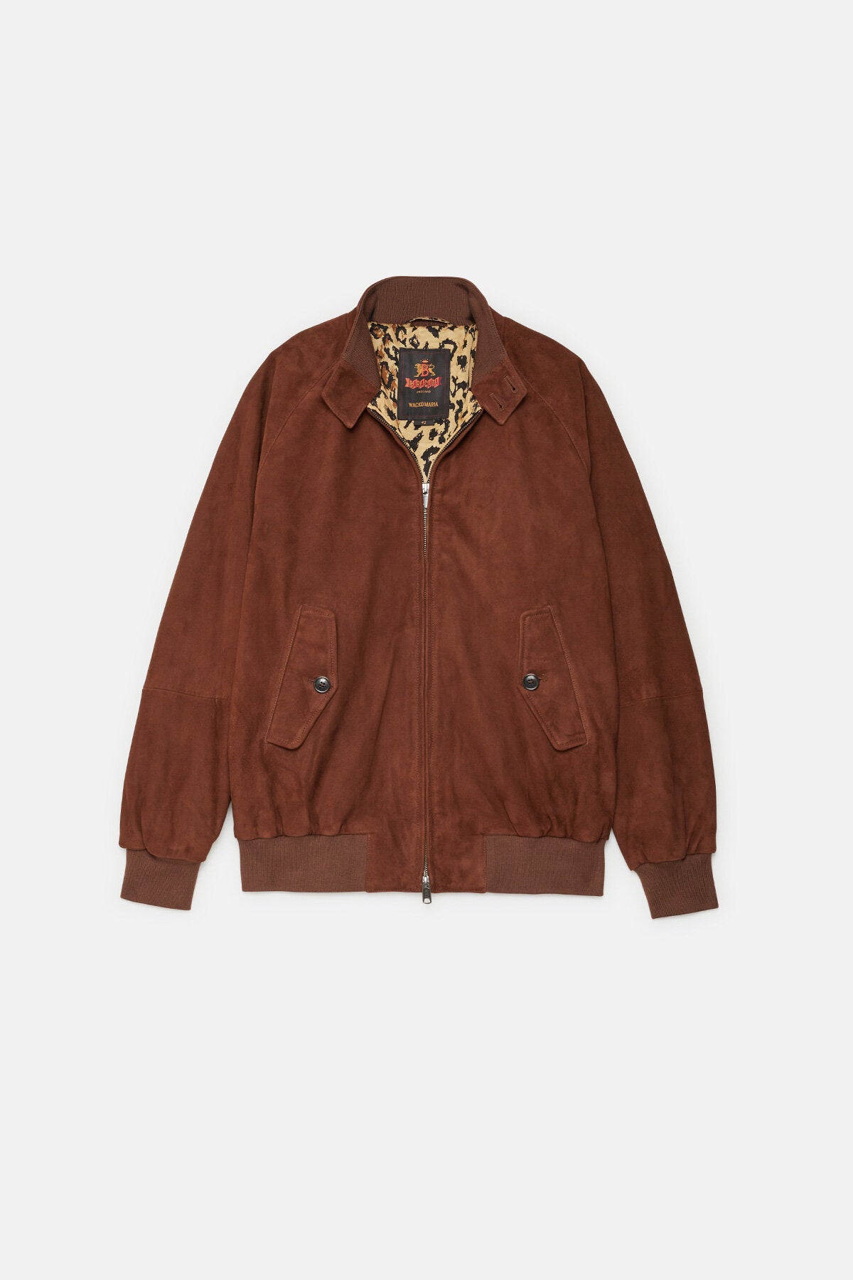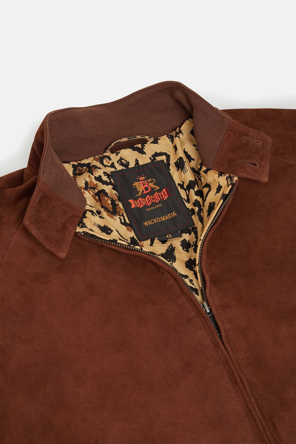 • Il G9 in pelle scamosciata in collaborazione con Wacko Maria fa il suo ritorno in un'accattivante versione con stampa animalier in tre fantastiche varianti cromatiche: Black, Tobacco e Chocolate. L’esterno della giacca è realizzato in pelle scamosciata premium di Baracuta, mentre l'iconica fodera con stampa leopardata all'interno conferisce al modello il tocco inconfondibile di Wacko Maria. Completa il tutto il discreto dettaglio con passante a catena in metallo. Il capospalla presenta inoltre un design moderno e un taglio più ampio, che donano al modello un look versatile e unisex.