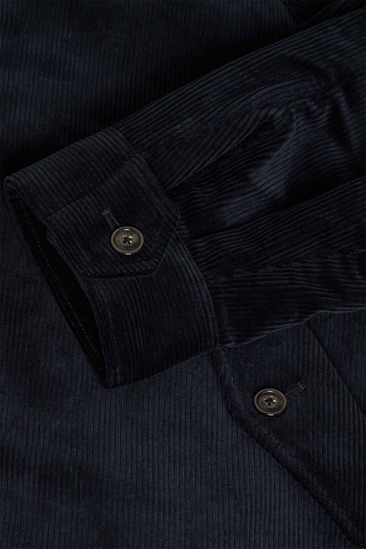 • • Ribbed tone on tone Dog Ear collar with a double button closure in personalised Baracuta buttons