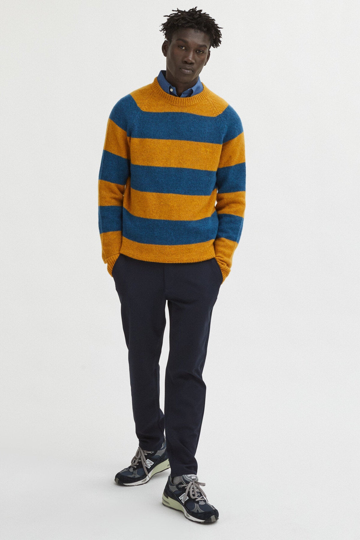Prepare yourself, our Shetland Stripes Crew Neck is here and it's incredibly soft and so comfortable you'll never want to part ways with it. It's characterised by the classic "shaggy dog" collar and the varsity-style stripes - typical of American Ivy League Colleges. The tone-on-tone embroidered logo detail embellishes the garment. We suggest pairing it with our G4 Cord for a relaxed yet put together look, also perfect for any setting, whether it be catching up with mates over a beer to spending a day at uni.